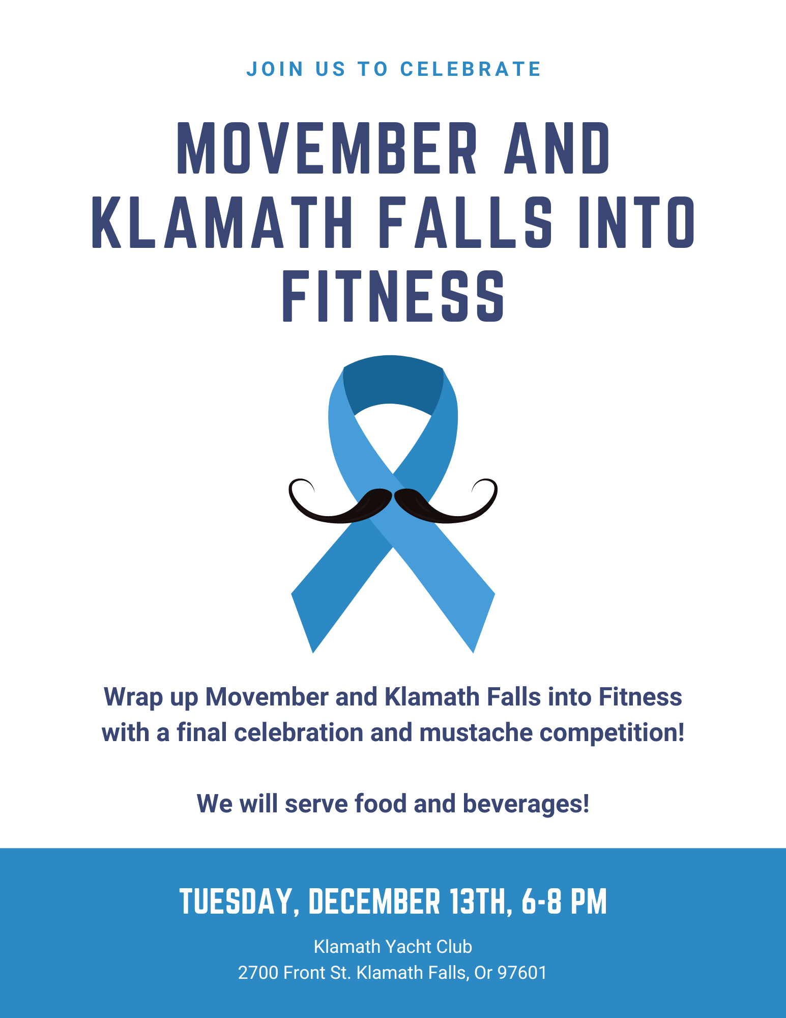 Join us on Tuesday, December 13th, 2022 from 6-8pm at the Klamath Yacht Club for a family-friendly, celebration for Movember and Klamath Falls into Fitness. Food will be served.