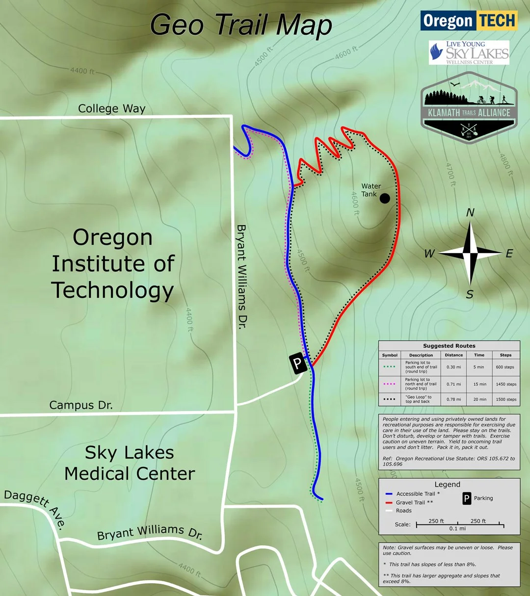 Since then, the trail has been consistently used by community members, Sky Lakes employees and OIT students, providing amazingly scenic views and opportunities for relaxation and physical activity all year round. The nearly 2-mile long recreational trail is located in the foothills Hogback Mtn and links Crystal Terrace, Sky Lakes Medical Center and Oregon Institute of Technology.